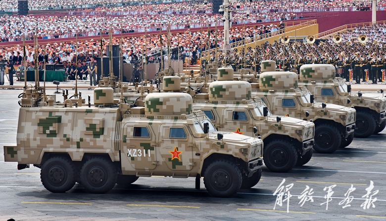 由国产新一代机动雷达组成的预警探测方队以威武之姿驶向天安门广场。