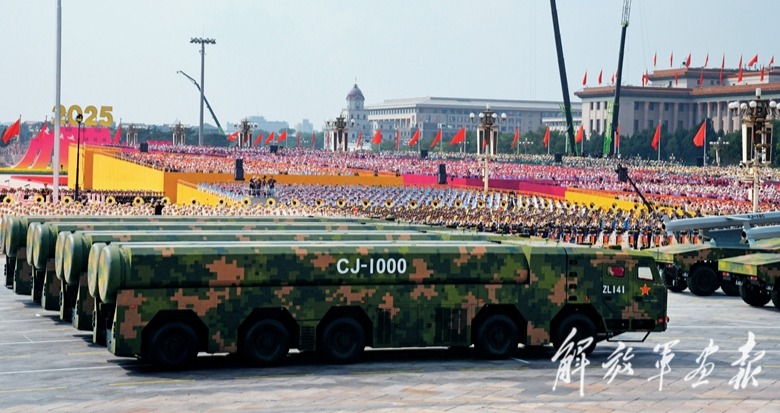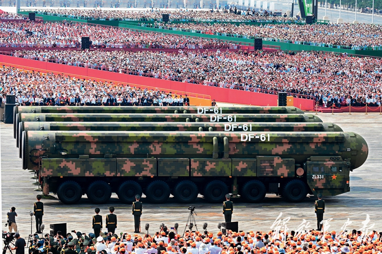 受阅的“惊雷-1”空基远程导弹、“巨浪-3”潜射洲际导弹、“东风-61”陆基洲际导弹、“东风-31”新型陆基洲际导弹,首次集中展示我军陆、海、空基“三位一体”战略核力量,是维护国家主权、捍卫民族尊严的战略“王牌”。