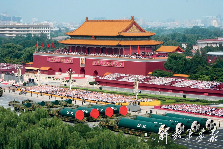 高超声速导弹方队和着时代的强音,沿着历史的车辙,以军种联合、人员融合的全新阵容,威武庄严地通过天安门广场。