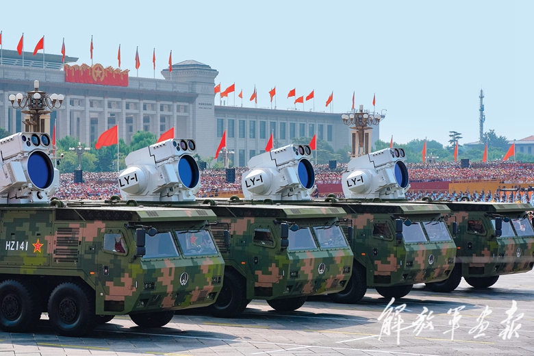 利箭昂首,傲视空疆,反无人机方队高能激光武器在阳光下熠熠生辉。放眼望去,新域新质作战力量的磅礴气势一览无余。