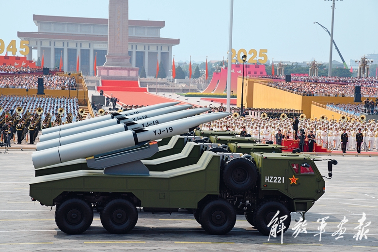 反舰导弹方队由鹰击-15导弹和鹰击-19、鹰击-17、鹰击-20高超声速导弹编成。这是我国新型反舰导弹的里程碑式亮相,受阅的反舰导弹均由我国自主研制,具有射程远、速度快、强毁伤、强突防等特点,可部署在舰载机、水面舰艇、潜艇等多种平台,完善了立体反舰体系,增强了人民海军远程快速打击能力,是捍卫海洋权益、争夺制海权的“战略重锤”。