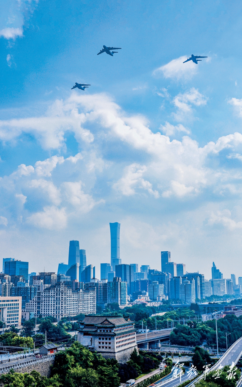 加受油机梯队飞临天安门广场上空。(摄影/新华社记者 肖艺九)