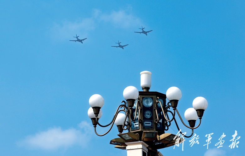 加受油机梯队以预加油状态飞过天安门广场上空,接受党和人民检阅。