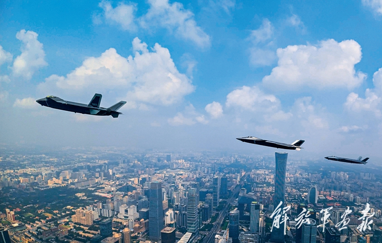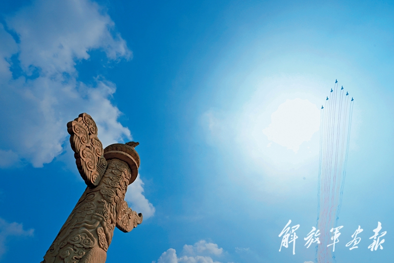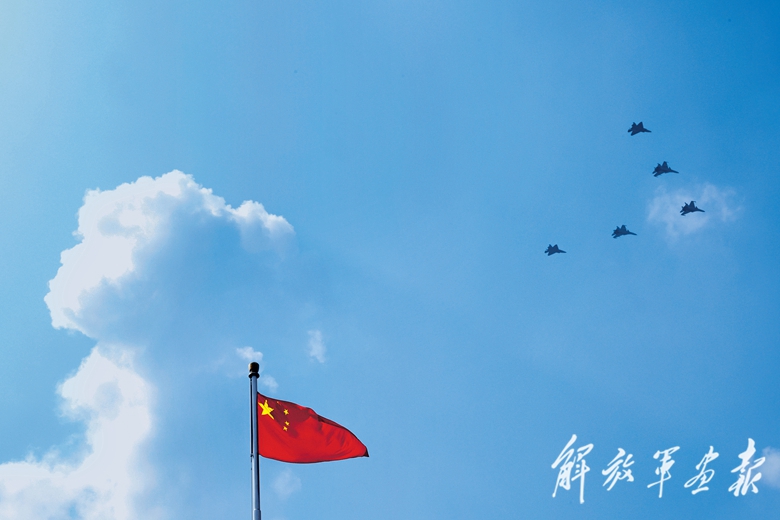 歼击机梯队以雷霆万钧之势飞越天安门上空。
