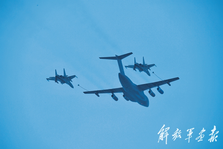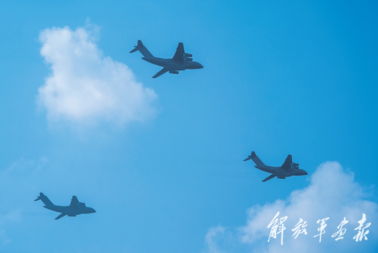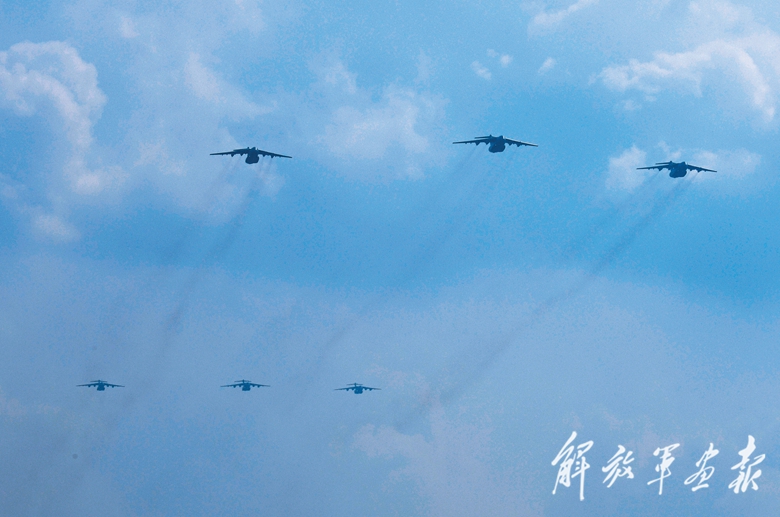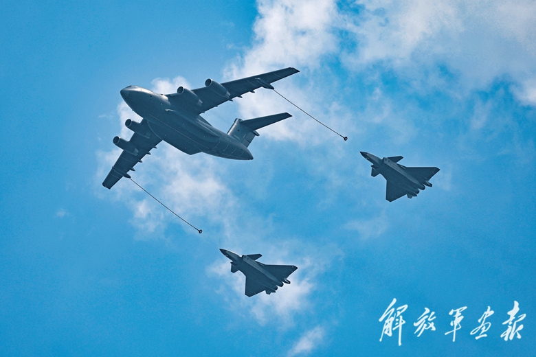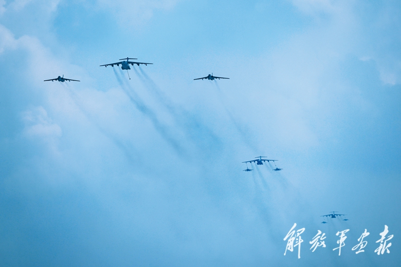 战机轰鸣,响彻云霄。3架运油-20A加油机伸出加油管,分别与2架轰-6N、2架歼-16以及2架歼-20组成3个“品”字形编队,模拟空中加油状态从观礼台上空飞过。作为我国自主研发的新一代空中加油装备,运油-20A的载油量更大、作战半径更广、滞空时间更长,能够有效增强空军航空兵的远程打击、持续作战能力。自服役以来,运油-20A常态与歼-20、歼-16、歼-10砺剑海天,联手出击,开展全天候复杂条件下加油训练,战斗足迹遍布高山远海、戈壁大漠。