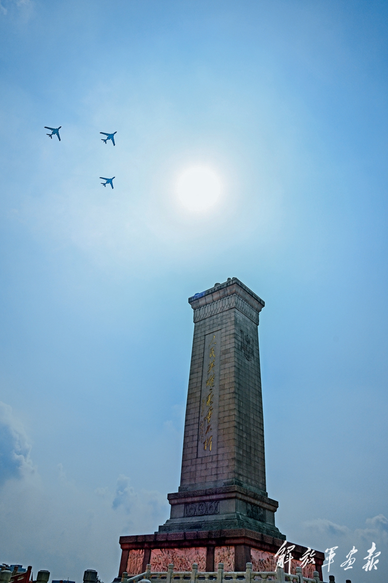 轰炸机梯队飞过人民英雄纪念碑上空。(摄影/新华社记者 张宏祥)