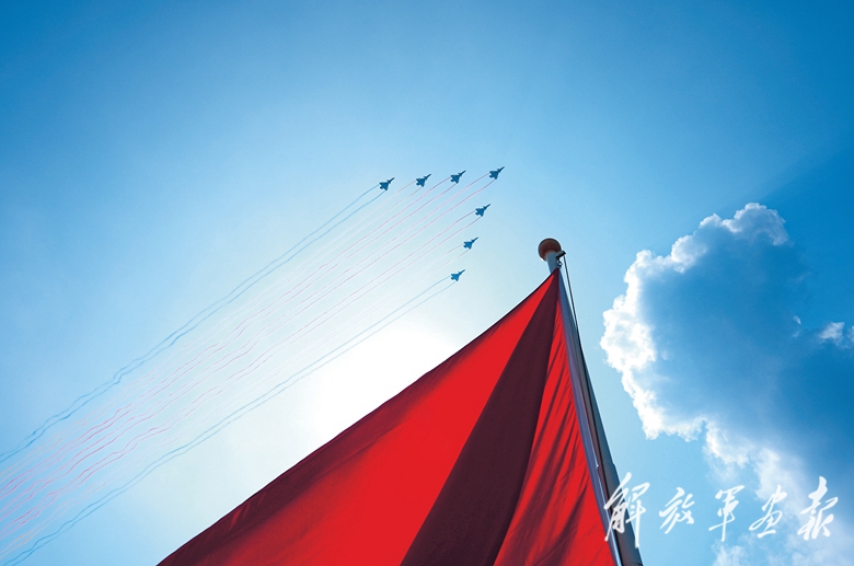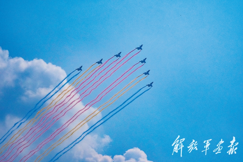 空军八一飞行表演队驾驶歼-10表演机,以超密集编队出场。7架战机在空中划出14道彩烟。彩烟以红、黄、蓝3种颜色构成。红色代表红色基因,黄色代表璀璨光明,蓝色代表空中力量守护安宁、守卫家国。14道彩烟在蔚蓝天空中画出绚烂航迹,寓意中华民族14年可歌可泣的抗战历程,象征14亿多中国人民奔向强国复兴的光明前景。