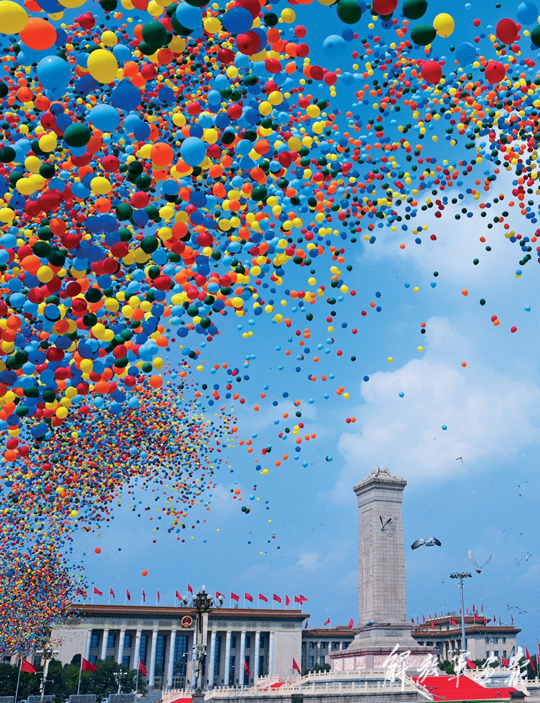 8万羽和平鸽振翅飞翔,8万只气球腾空而起,飞过天安门城楼,飞越人民英雄纪念碑,飞向更高更远的蓝天。