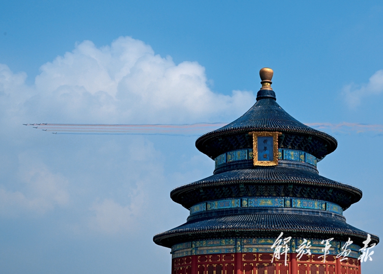 这是在北京天坛公园拍摄的空中梯队。(摄影/新华社记者 赵子硕)