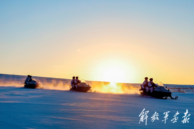 官兵驾驶摩托雪橇在茫茫雪原上前进。