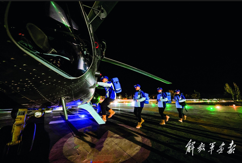 夜间,神舟医疗救护队进行托举接应救援训练。