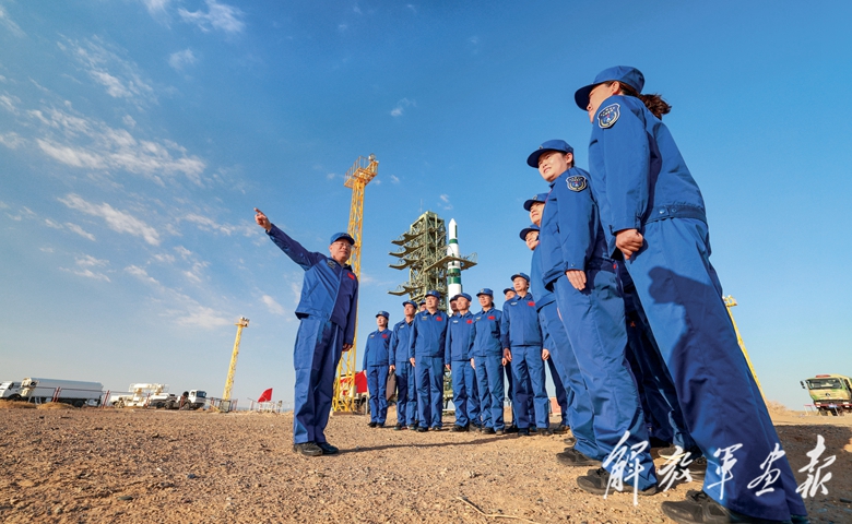 神舟医疗救护队在“东方红”卫星发射塔架前开展现地教育,队员们重温中国航天史,立志传承航天精神。