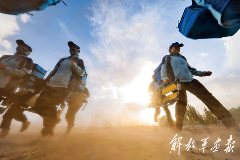在漫天沙尘中,神舟医疗救护队进行应急转运训练。