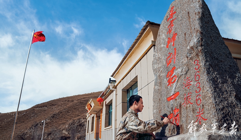 哨所战士为石刻描红。