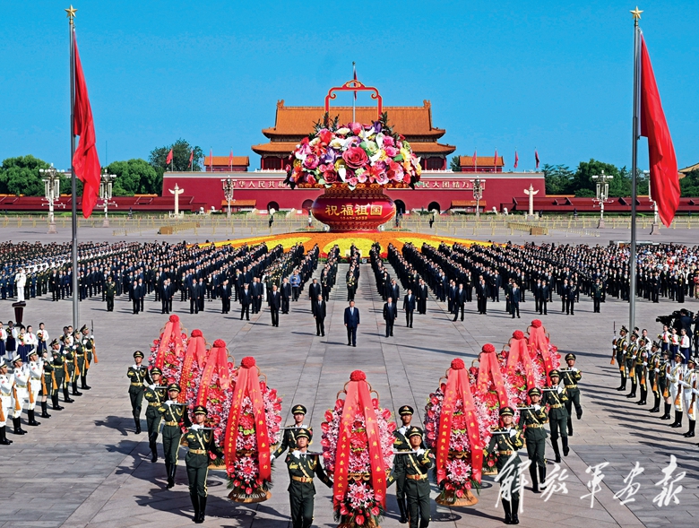 方阵前,以中共中央,全国人大常委会,国务院,全国政协,中央军委,各民主党派、全国工商联和无党派爱国人士,各人民团体和各界群众,老战士、老同志和烈士亲属,中国少年先锋队名义敬献的9个大型花篮一字排开,花篮红色缎带上书写的“人民英雄永垂不朽”格外醒目。